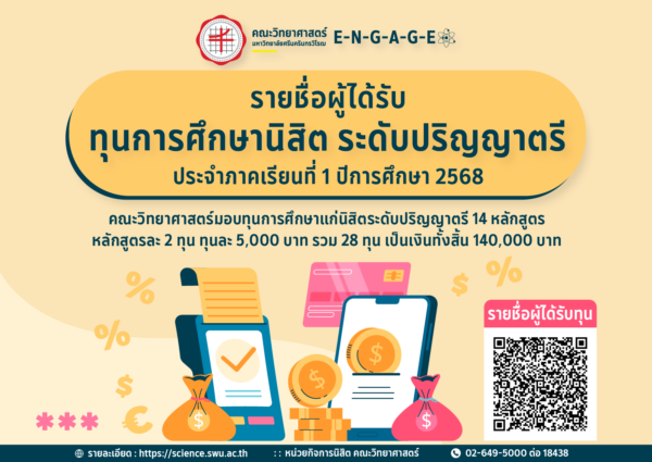 ℹ️ รายละเอียดเพิ่มเติมได้ที่ : หน่วยกิจการนิสิต สำนักงานคณบดี คณะวิทยาศาสตร์ มหาวิทยาลัยศรีนครินทรวิโรฒ โทร 02 – 649-5000 ต่อ 18438